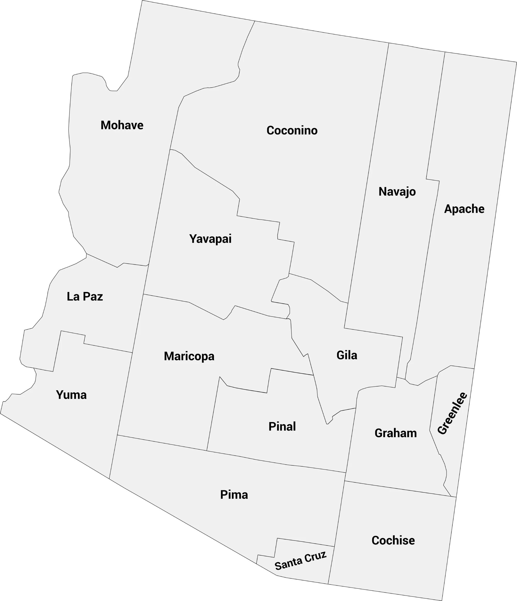 Apache, Cochise, Coconino, Gila, Graham, Greenlee, La Paz, Maricopa, Mohave, Navajo, Pima, Pinal, Santa Cruz, Yavapai, and Yuma.